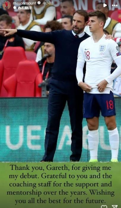 芒特:“感谢你,加雷斯,感谢你给我英格兰队首秀的机会。感谢你和教练组多年来的支持和指导,祝你未来一切顺利。